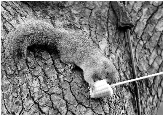 游人市民们拿瓜子和玉米粒引诱它,它一边用那双乌溜溜的大眼睛警惕地看着树下的人们,一边慢慢移动,伸出小爪子捞走食物,迅速回到树上。