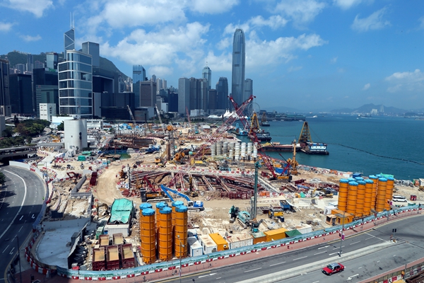 这是香港湾仔发展计划第二期工程工地一角(2015年4月5日摄)。 1月13日,香港特区行政长官梁振英在特区立法会发表2016年施政报告,以“创新经济、改善民生、促进和谐、繁荣共享”为主题,宣布了一系列政策措施,涉及发展经济,推动创新与科技发展,加强教育及改善医疗服务等。新华社记者李鹏摄