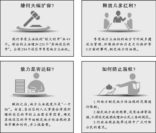 在立法法修改之前,除了省级之外,地方立法权仅为省会城市、经国务院批准的较大的市等少数城市所有。出于根据地方实际因地制宜的渴望,地方立法权曾经让不少地区十数年梦寐以求。如今,地方立法权已经下放一周年,这项由党的十八届三中、四中全会提出的重大改革,其改革红利在各地如何兑现?面对从未拥有过的新权力,各地又是否有能力接得住?