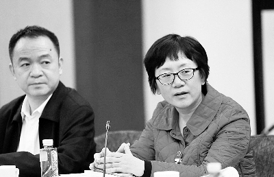 9日,孙洁(右)委员在小组讨论会上发言时谈到了工伤保险、延迟退休等话题。摄/记者 吴海浪