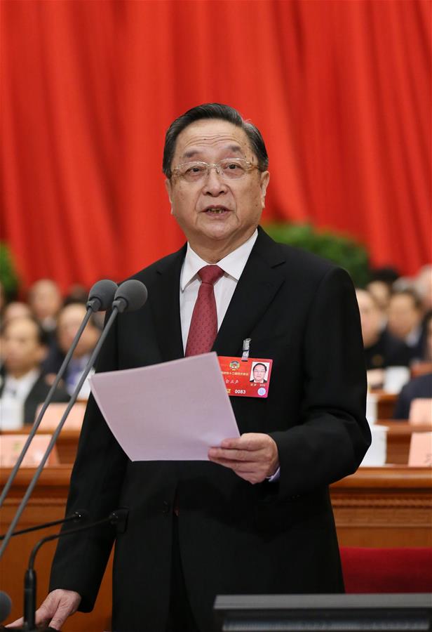 Yu Zhengsheng, chairman of the National Committee of the Chinese People's Political Consultative Conference (CPPCC), presides over the closing meeting of the fourth session of the 12th CPPCC National Committee at the Great Hall of the People in Beijing, capital of China, March 14, 2016. [Photo/Xinhua]