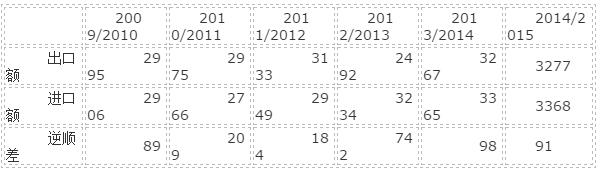 进出口总额:6632亿澳元,比上年同期增长2.3%。其中,出口3267亿澳元,增长2.4%;进口3365亿元,增长2.2%。贸易逆差98亿澳元,下降4.9%。(2014年12月)