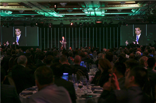 中午,克强总理在新西兰各界欢迎午宴上热情致辞。他说,中新合作的高峰没有止境,两国携手并肩可以攀上更高高度,为两国人民带来更多福祉,为地区和世界带来友好合作的信号。