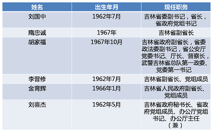 吉林省人民政府领导目前为“一正四副”配备,另外省政府秘书长刘喜杰也是省政府党组成员。从年龄上看,吉林省政府领导班子全为“60后”,最年轻的是出生于1967年的副省长隋忠诚,今年刚50岁。