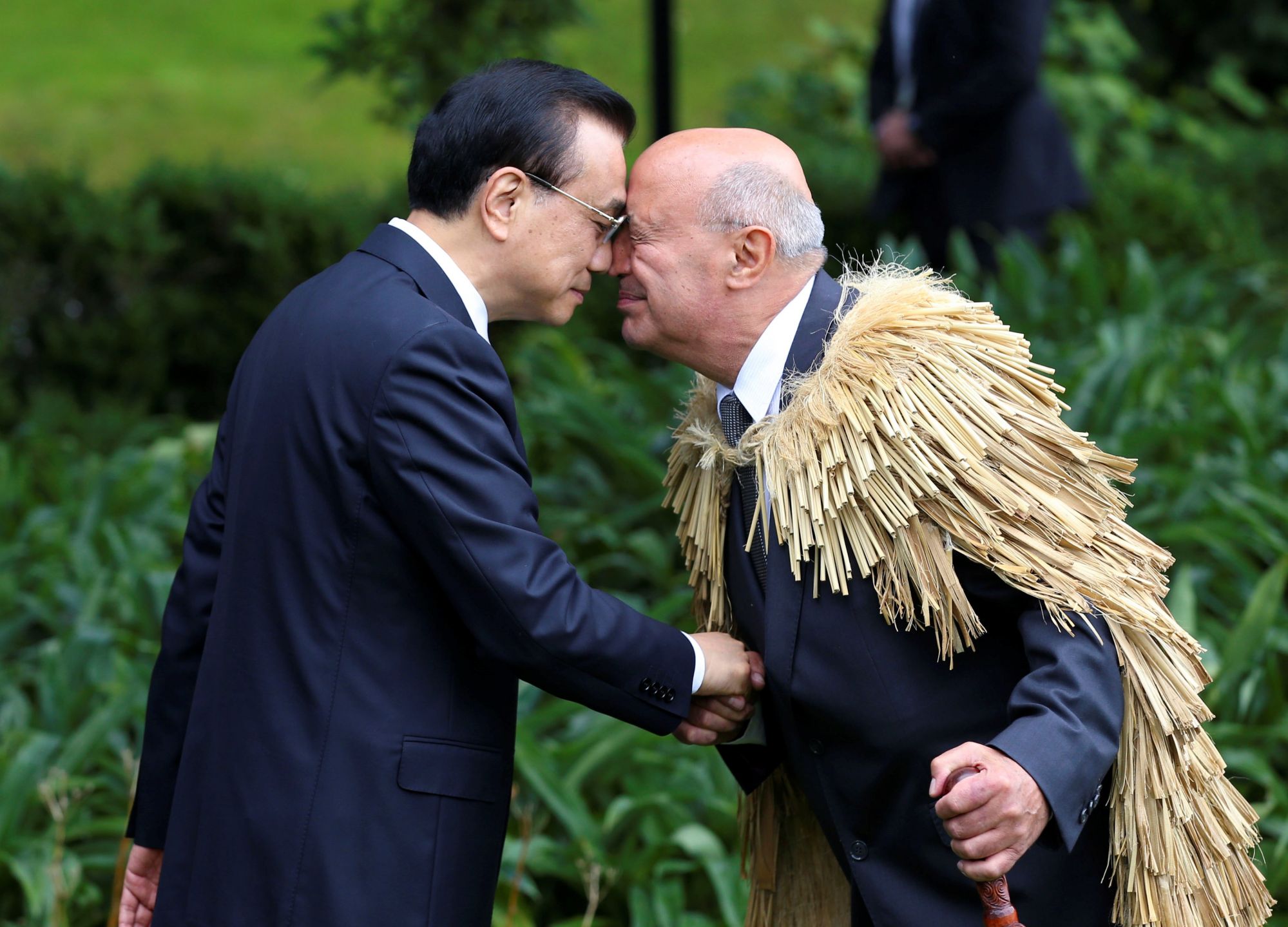 跨越塔斯曼海,克强总理来到新西兰首都惠灵顿。当地时间27日,在总督府大草坪上,克强总理与一名毛利文化顾问行“碰鼻礼”。