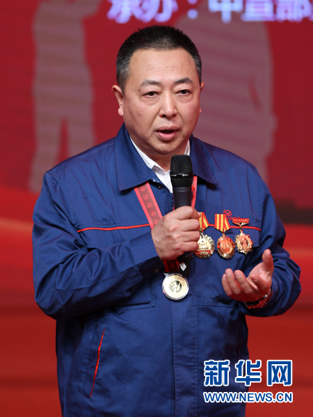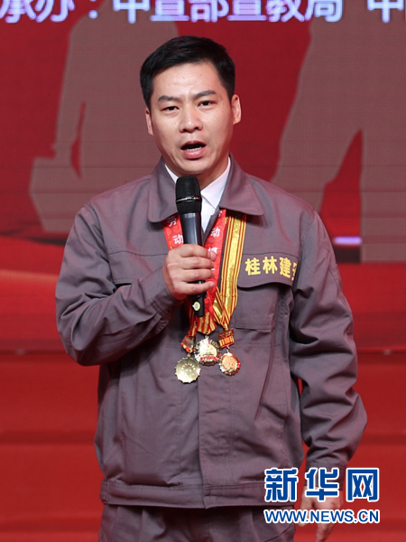 广西桂林建筑安装工程有限公司抹灰工祝平辉在“最美职工”发布仪式上(4月21日摄)。 新华社记者 才扬 摄