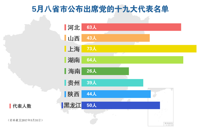 公开报道显示,截至5月底,贵州、黑龙江、海南、上海、湖南、陕西、河北和山西八省份先后公布了本省市出席党的十九大代表名单。