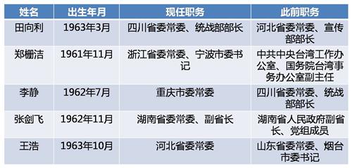 从此前职务来看,王浩、李静、田向利3人为跨省调任。四川原省委常委、统战部部长李静调任重庆市委常委,河北原省委常委、宣传部部长田向利调任四川,出任李静此前职务。山东原省委常委、烟台市委书记王浩调任河北省委常委。