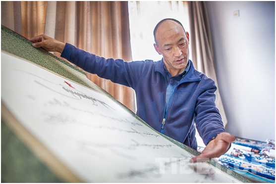 每项工作的出色完成,靠的不仅仅是久米次成严谨的工作态度,还依赖于他深厚的文化功底。毕业于北京中国藏语系高级佛学院的他,精通藏梵文,酷爱书法。作为西藏书法家协会副主席的久米次成,其藏梵文书法在各地市珍藏达数百幅,先后荣获全国和西藏的多种奖项。为了更好地传承和弘扬藏文化,久米次成开始免费义务收徒教授藏文书法,到目前为止,已经有600多名学生,遍布西藏各地,有的学生已经成长为老师,开始了自己的藏文化传承之路。