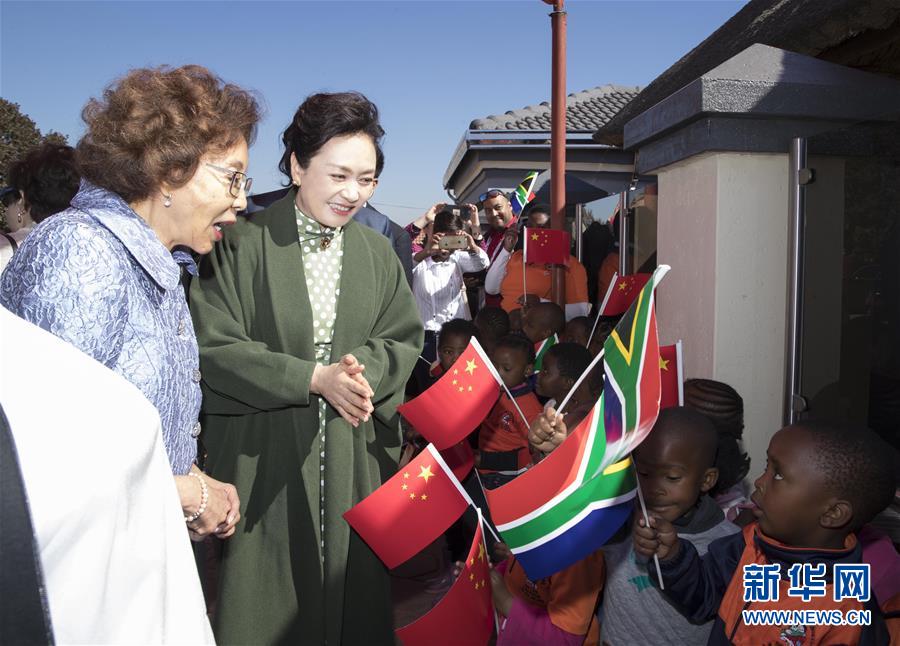 当地时间7月24日上午,国家主席习近平夫人、联合国教科文组织促进女童和妇女教育特使彭丽媛在南非总统夫人莫采佩陪同下,参观位于比勒陀利亚东郊的乌坦多社区托儿所。 新华社记者 王晔 摄