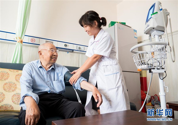 近年来,河北省武邑县积极引导医疗机构开展“医养结合”新型养老服务,让老人乐享幸福晚年。图为县医院医养中心工作人员在养老公寓为老人测量血压。新华社记者朱旭东摄