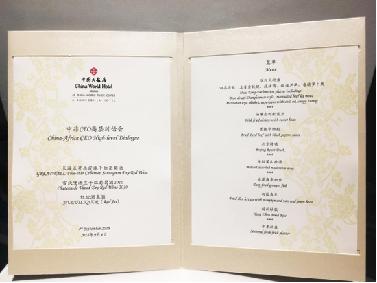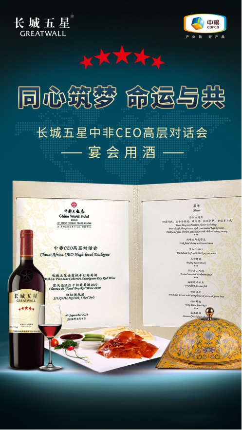 中非CEO高层对话会作为中非合作论坛北京峰会的重要组成部分,是中非团结合作的又一历史性盛会。国有大事,必饮长城。长城五星赤霞珠干红葡萄酒作为承载着国家外交礼仪的国宴招待用酒,亮相中非CEO高层对话会午宴,成为中非友好的美酒见证者,在外交舞台上以崭新的风貌向各国宾客展示着中国民族品牌的风采。