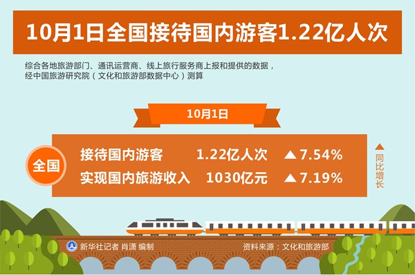 新华社北京10月1日电(记者胡浩)记者1日晚从文化和旅游部了解到,综合各地旅游部门、通讯运营商、线上旅行服务商上报和提供的数据,经中国旅游研究院(文化和旅游部数据中心)测算,10月1日全国接待国内游客1.22亿人次,同比增长7.54%;实现国内旅游收入1030亿元,同比增长7.19%。