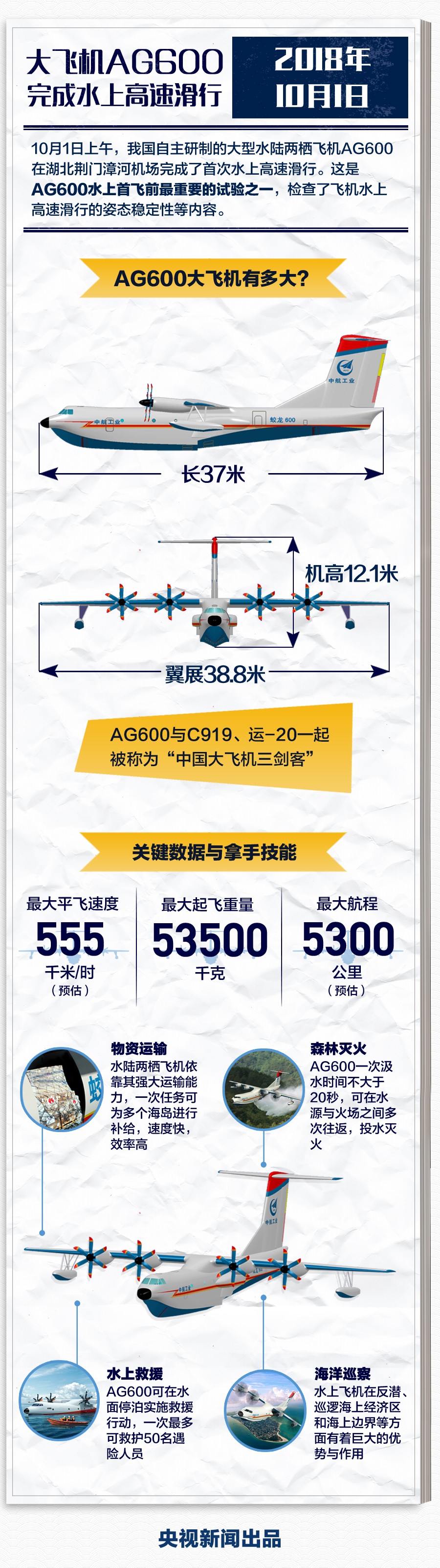 10月1日,新中国69岁华诞之际,我国自主研制的大型水陆两栖飞机AG600在湖北荆门漳河机场完成了首次水上高速滑行,这是AG600在水上首飞前进行的最重要的试验之一。