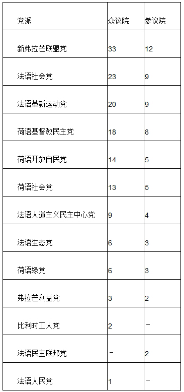 (7)法语革新运动党(MR):前身是建于1846年的自由党(PL),是比利时历史最久的政党,后分裂。2002年3月24日,法语革新自由党(PRL)、法语民主阵线(FDF)、国民革新运动(MCC)合并组成法语革新运动党(MR)。现任党主席夏斯特尔·奥利维(Chastel Olivier)。