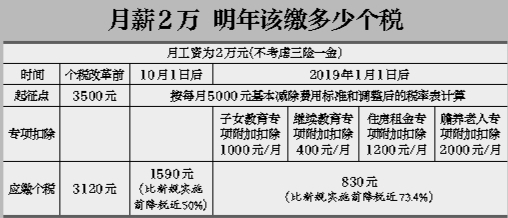 举例来看,假设某纳税人的月工资为2万元(不考虑三险一金),个税改革前起征点是3500元,他每月应缴纳个人所得税3120元。今年10月1日以后取得工资,按每月5000元基本减除费用标准和调整后的税率表计算,应缴纳个人所得税1590元,比新规定实施前少缴纳税款1530元,税负降低近50%。