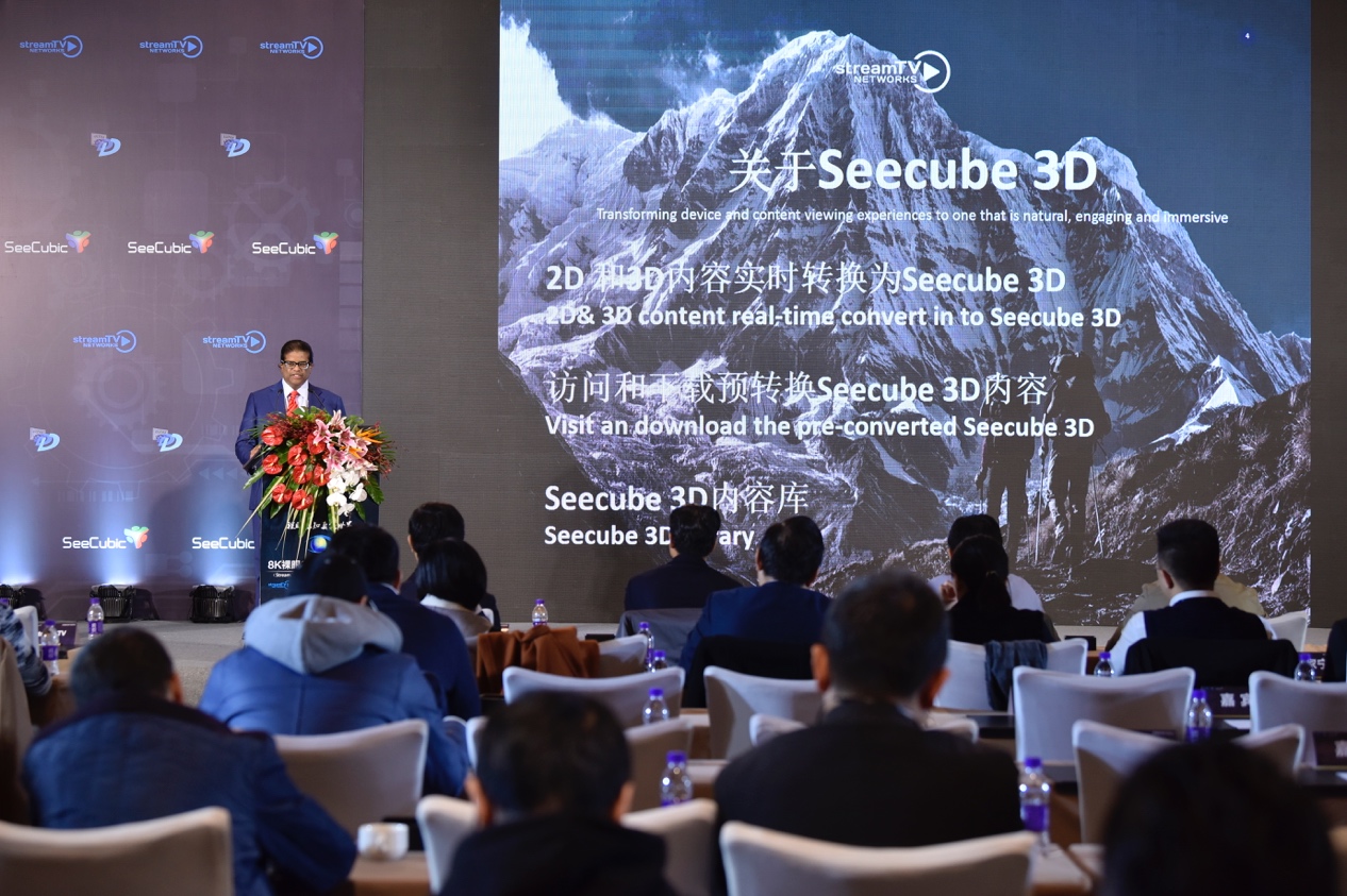 11月29日,Stream TV Networks Inc. 8K裸眼3D新产品发布暨与京东方战略合作发布会在北京金融街威斯汀大酒店举办。发布会以“裸眼感知真实世界”为主题,发布了最新的65寸8K裸眼3D显示器、10.1英寸裸眼3D显示屏等多款突破性技术的高清裸眼3D系列新产品,向大众展示了显示市场更多的可能性。Stream TV Networks Inc.(以下简称Stream TV) 总裁 Mathu Rajan出席本次发布会,并为现场来宾和媒体介绍并展示了其独家Seecube 3D技术及其最新产品。