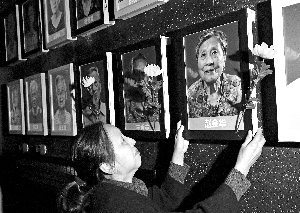 6日,侵华日军南京大屠杀遇难同胞纪念馆为最近去世的南京大屠杀幸存者王秀英、赵金华、陈广顺举行熄灯悼念仪式,馆内大屠杀幸存者照片墙上王秀英、赵金华、陈广顺三位老人的照片灯箱在仪式中熄灭,纪念馆工作人员及三位老人的亲属等共同默哀、献花,进行悼念。图为赵金华的女儿赵敏在母亲遗像前哭悼。据侵华日军南京大屠杀遇难同胞纪念馆介绍,2018年已有20位南京大屠杀幸存者去世。新华社发
