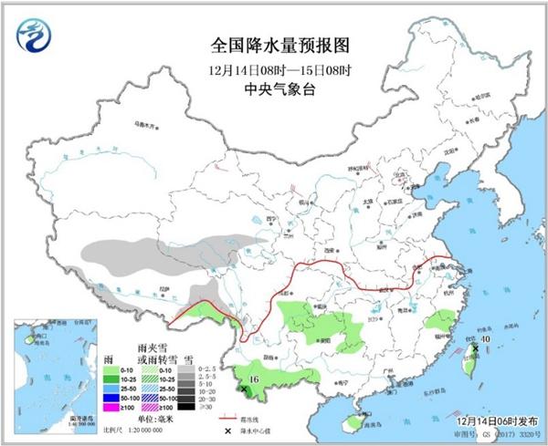 未来三天,冷空气“暂停营业”,全国雨雪不强,分布零散。今天全国降水仍以弱雨雪为主,中央气象台预计,12月14日08时至15日08时,西藏南部和北部、青海中南部等地有小雪或雨夹雪。云南南部、贵州中北部、四川盆地南部、湖南西部、福建北部、浙江南部、海南岛中部、台湾岛东部等地的部分地区有小到中雨。