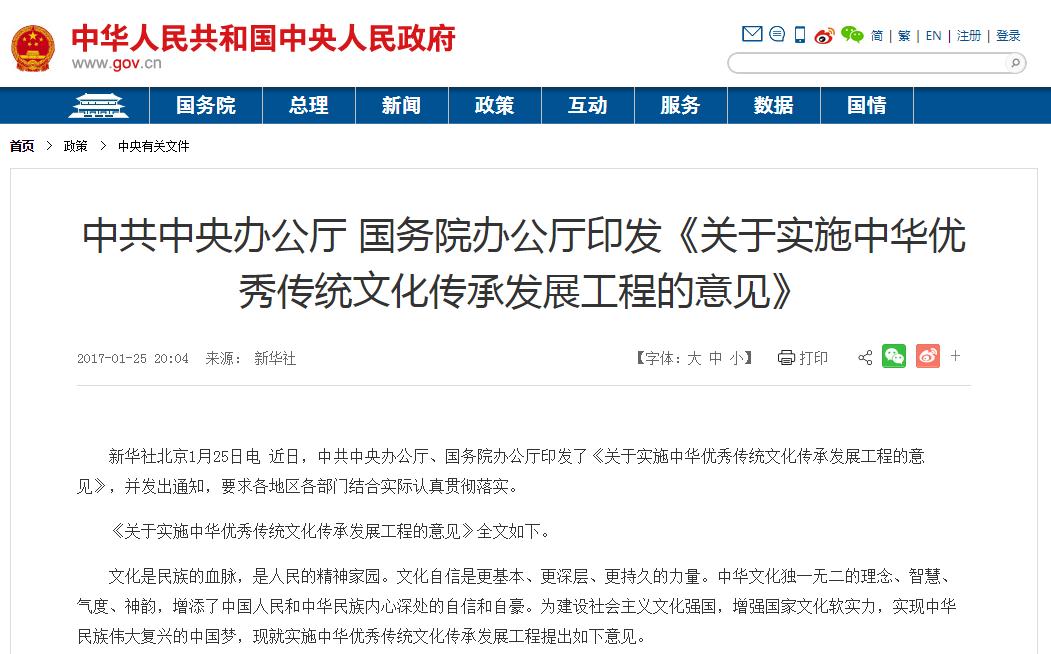 《关于实施中华优秀传统文化传承发展工程的意见》是中共中央办公厅、国务院办公厅于2017年1月25日发布的,记者阅读全文后并未发现网传文章中所提到“抵制洋节”的字样。