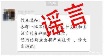 近日,有网民反映微信群里盛传这样一条消息:“转发通知:各群一律不许发庆祝过平安夜和圣诞节的各种微信和短信。经网信局查出将严肃追责,请大家切记!”