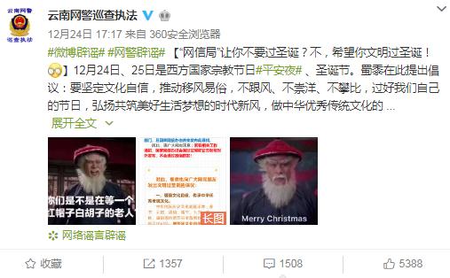 人民网北京12月25日电(孝金波 钟亚楠)近日,网传“网信局不许发庆祝过平安夜和圣诞节的信息”,引起网民关注。24日,云南网警官方微博发布辟谣称,经核实,我国并没有名为“网信局”的部门,且中央网信办也并未发布此通知。