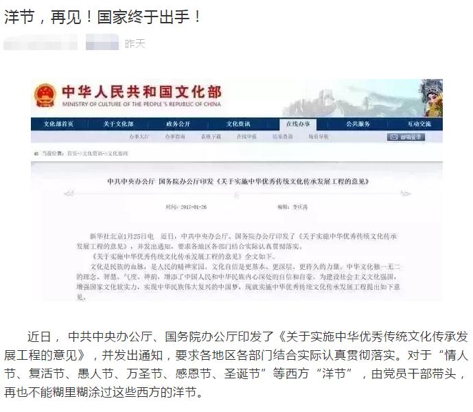 除此之外,一篇题为《洋节,再见!国家终于出手!》的文章在网上被大量转发。文中写道:“近日, 中共中央办公厅、国务院办公厅印发了《关于实施中华优秀传统文化传承发展工程的意见》,并发出通知,要求各地区各部门结合实际认真贯彻落实。对于情人节、复活节、愚人节、万圣节、感恩节、圣诞节等西方‘洋节’,由党员干部带头,再也不能糊里糊涂过这些西方的洋节。”
