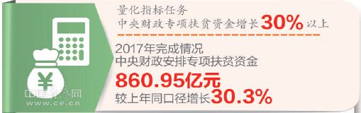 2017年,我国大力支持脱贫攻坚。中央财政专项扶贫资金增长30.3%,农业、教育、医疗、交通等领域资金同步加大对贫困地区投入力度。我国将贫困县财政涉农资金整合试点推广到全部贫困县。2017年,贫困县整合财政涉农资金2956亿元,比上年增加26%。