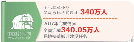 2017年,我国顺利完成340.05万人易地扶贫搬迁建设任务。对22个有搬迁任务省份开展全覆盖的常态化稽查,及时推动问题整改。
