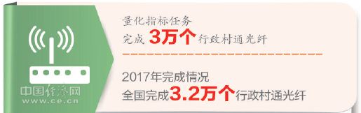 截至2017年底,电信业已完成3.2万个行政村通光纤的电信普遍服务任务部署,行政村通光纤比例达到94%。全国农村宽带用户达到9377万户,比上年增长25.8%,增速较上年提高9.3个百分点。
