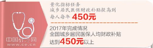 2017年,全国城乡居民医保人均财政补助标准在2016年的基础上再获提升,达到平均每人每年450元。随着医保制度不断健全,政府投入逐年增加,医保保障水平稳步提高,保障范围明显扩大。在提高居民医保筹资标准、按规定落实困难人群个人缴费补助的基础上,我国还合理确定大病保险筹资标准,增强大病保险保障能力,并加大大病保险向困难人员倾斜政策力度,通过降低起付线、提高报销比例等实施精准支付政策,贫困人口受益水平得到切实提高。