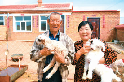 内蒙古苏尼特右旗朱日和镇公忽洞村的冀德民和老伴杭瑞抱着小羊羔站在新房前。