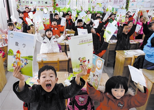 2月25日,在江苏省连云港市实验学校一年级2班,学生们在展示刚刚发放的新学期新课本。 耿玉和摄(新华社发)