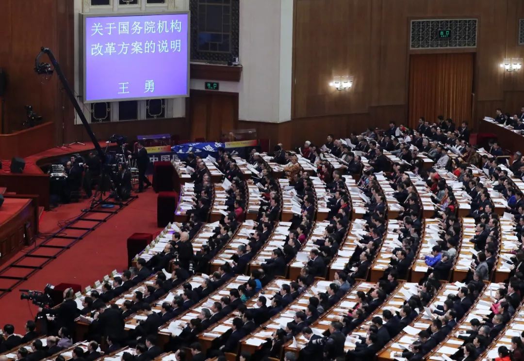 3月13日,十三届全国人大一次会议在北京人民大会堂举行第四次全体会议。受国务院委托,国务委员王勇作关于国务院机构改革方案的说明。 新华社记者 王晔 摄