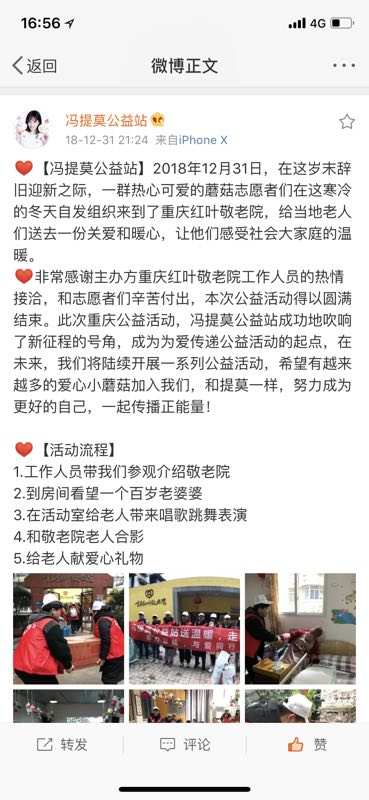 新年伊始,在我们大多数人都在利用假期放松身心、举办新年庆祝活动时,冯提莫粉丝已经展开了一次又一次公益活动。与以往的活动不同的是,此次活动跨越全国三个城市,而且采取线下活动的模式,召集粉丝志愿者们亲自为敬老院的老人们献一份爱心。冯提莫公益站筹办了分为重庆、上海、成都三站的敬老院慰问,给老人们带去冬日里的温暖。