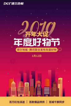 新的一年,德尔地板进一步创新营销玩法,推出百城千群同步狂欢,借助腾讯强大的生态体系,在全国各大城市建立用户群,邀请意向用户加入,直接与消费群体展开交互,准确了解用户需求,传播活动优惠,帮助意向用户种草。活动引爆当天,德尔地板将在全国超过1000个用户社群,同步开启年度好物节,