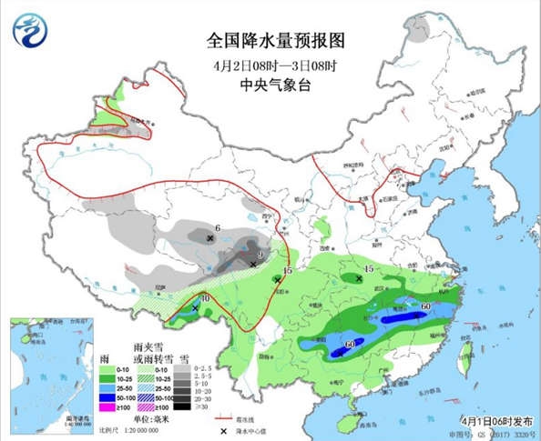 今天南方的降雨会短暂减弱,中央气象台预计,1日8时至2日8时,新疆沿天山地区、青海中南部、西藏中东部、川西高原北部等地的部分地区有小到中雪或雨夹雪,局地大雪。华南中西部、云南东南部等地的部分地区有中到大雨,其中,广西中南部等地局地有暴雨。