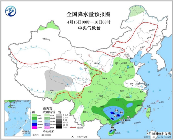 4月15日08时至16日08时,西藏中北部、青海南部等地的部分地区有小雪或雨夹雪,江南中南部、华南大部、贵州中南部等地的部分地区有中到大雨,其中广西北部和东南部、广东北部和南部沿海、海南岛北部等地的局部地区有暴雨(50~80毫米)。华北北部和西部、西北地区东北部、黄淮等地的部分地区有4~6级风。