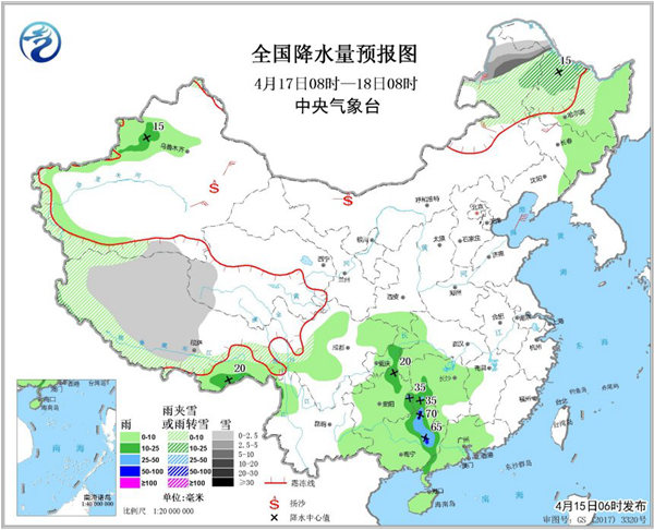 4月17日08时至18日08时,内蒙古东北部、黑龙江中西部、南疆西部、西藏大部、青海西部、川西高原等地的部分地区有小到中雪或雨夹雪,其中,内蒙古东北部局地有大雪。伊犁河谷、西藏东南部、湖南西南部、重庆中部、贵州东部、广西东部、广东西南部等地的部分地区有中到大雨,其中,广西东部局地有暴雨(50~70毫米)。内蒙古东部和西部、吉林西部、新疆东部等地的部分地区有4~6级风。南疆盆地东部、内蒙古西部有浮尘或扬沙天气。