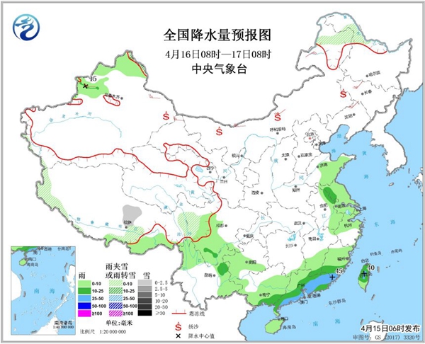 4月16日08时至17日08时,内蒙古东北部、黑龙江西北部、北疆北部、西藏中部和南部、川西高原等地部分地区有小雪或雨夹雪。北疆西部、四川南部、云南东北部、安徽东北部、江苏西北部、华南大部等地的部分地区有中到大雨(10~45毫米)。内蒙古大部、东北地区中南部、伊犁河谷、北疆东部、甘肃西部等地的部分地区有4~6级风。南疆东部、内蒙古中部和西部有浮尘或扬沙天气。
