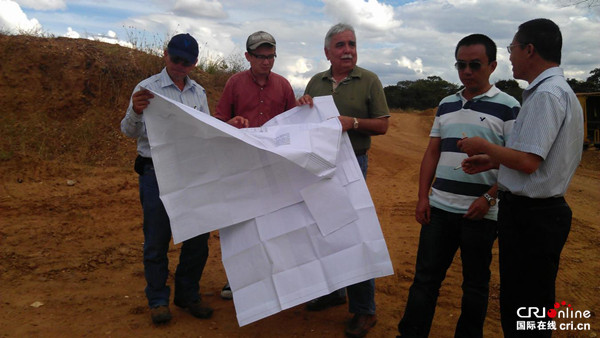 中国前驻委内瑞拉大使赵荣宪在委铁项目施工现场听取时任中国中铁委内瑞拉分公司常务副总经理甘百先(现任中铁国际集团董事长、党委书记)的工作汇报