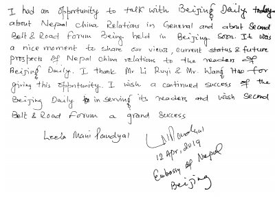 今天我与北京日报记者讨论了中尼两国关系和即将举行的第二届“一带一路”国际合作高峰论坛。通过这个机会,我们表达了尼泊尔的观点、现状和对“一带一路”倡议的展望。感谢北京日报对我的采访。希望北京日报越办越好,同时期待第二届高峰论坛取得更多成果。