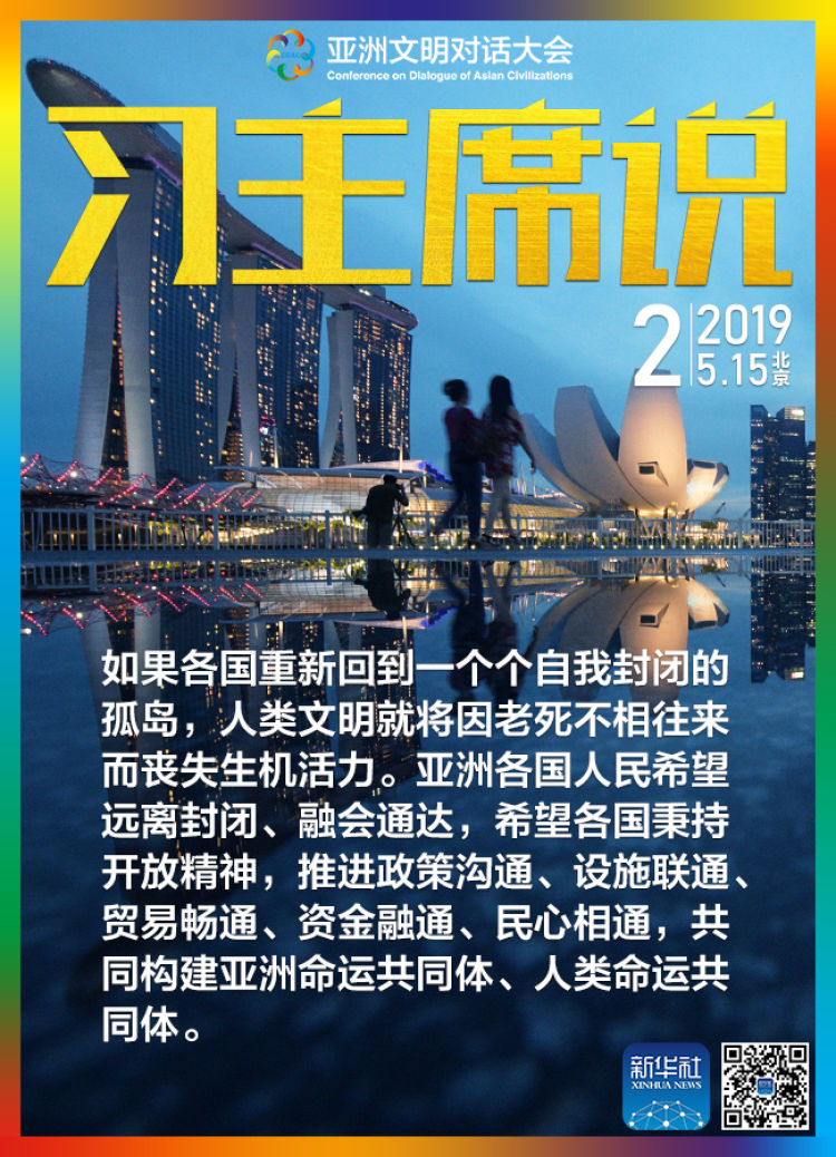 如果各国重新回到一个个自我封闭的孤岛,人类文明就将因老死不相往来而丧失生机活力。亚洲各国人民希望远离封闭、融会通达,希望各国秉持开放精神,推进政策沟通、设施联通、贸易畅通、资金融通、民心相通,共同构建亚洲命运共同体、人类命运共同体。