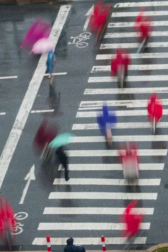 2018年5月25日,江苏省南通市海安县出现暴雨天气,雨中的行人穿过斑马线,远远望去就像一个个跳跃的音符。