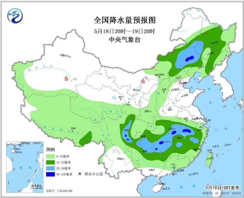 5月18日20时至19日20时,内蒙古中东部、东北地区中部、四川盆地西部、西南地区东部、江汉、江南等地的部分地区有中到大雨,其中内蒙古东南部、四川盆地西南部、湖南北部、湖北南部、安徽南部等地局地有暴雨(50~80毫米),上述部分地区有短时强降水,局部并伴有雷暴大风等强对流天气。西北地区中东部、内蒙古大部、华北、东北等地的部分地区有5~7级风,局地阵风8~9级。内蒙古西部、南疆盆地等地有扬沙或浮尘天气。
