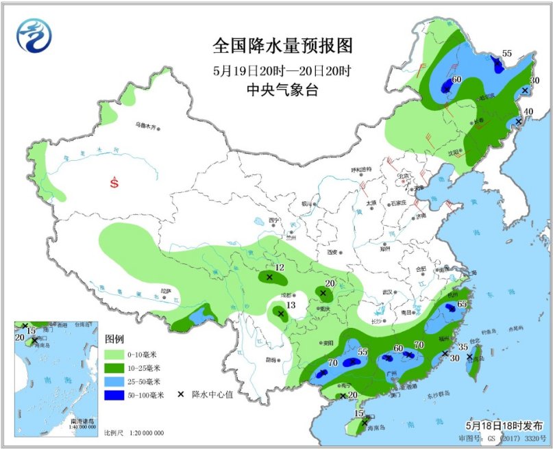 5月19日20时至20日20时,内蒙古东北部、东北地区中北部、江南南部和东部、华南大部等地的部分地区有中到大雨,局地有暴雨(50~70毫米)。内蒙古中东部、华北、黄淮、东北地区中南部等地的部分地区有4~6级风,阵风7~8级。南疆盆地等地局地有扬沙或浮尘。渤海西南部海域将有7~8级、阵风9~10级的西北风。