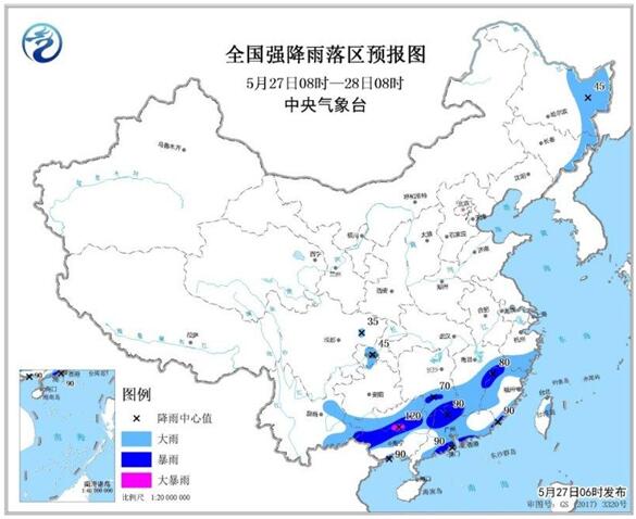 5月27日08时至28日08时,江南南部和中东部、华南大部、云南东部、重庆西南部及东北地区东部等地有中到大雨,其中,湖南南部、江西东部、福建西北部和东南部沿海、广西中部和南部沿海、广东北部以及南部沿海等地的部分地区有暴雨,局地大暴雨(100~120毫米),上述局部地区并伴有雷暴大风等强对流天气。新疆北部、内蒙古东部、河北北部、东北地区中南部、黄淮、江汉等地的部分地区有4~6级风(见图2)。