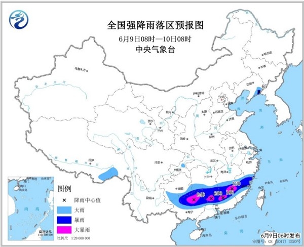 人民网北京6月9日电 据中国天气网消息 中央气象台6月9日06时继续发布暴雨黄色预警:预计,6月9日08时至10日08时,浙江南部、福建西部和中北部、江西中南部、湖南中南部、贵州南部、广西中北部、广东北部等地有大到暴雨,其中,福建西南部、江西南部、湖南南部、广西北部、广东北部的部分地区有大暴雨(100~240毫米),局地并伴有雷暴大风等强对流天气,最大小时降水量30~50毫米,局地可达60毫米以上。