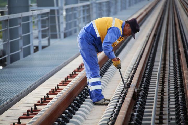 中铁大桥局中俄同江铁路大桥项目的建设者正在对钢轨精度进行微调(6月4日摄)。