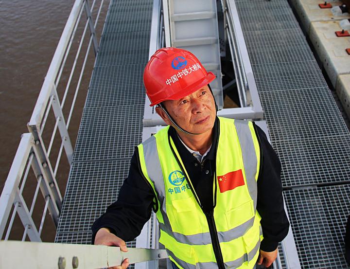 中铁大桥局集团同江中俄铁路大桥项目经理部党工委书记林永汉在检视大桥。(6月4日摄)